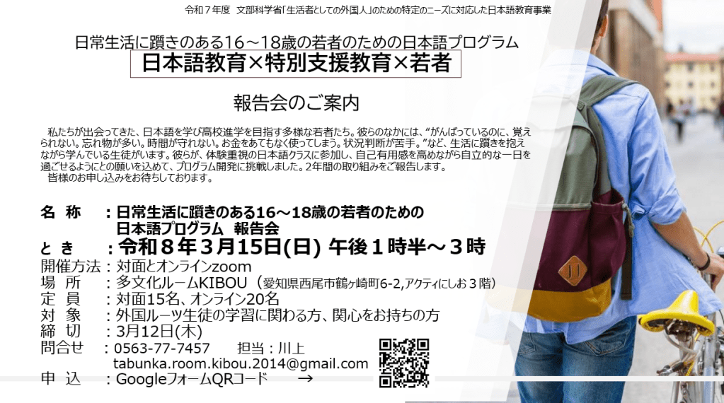 令和8年3月15日(日)、午後1時半より 文科省委託事業「生活者としての外国人」のための特定のニーズに対応した日本語教育事業『日本語教育×特別支援教育×若者』の報告会を開催いたします。※対面とオンラインZoom