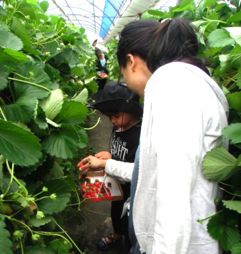 As crianças que acabaram de chegar no Japão, as que nunca tinham apanhado morangos fizeram a maior festa.