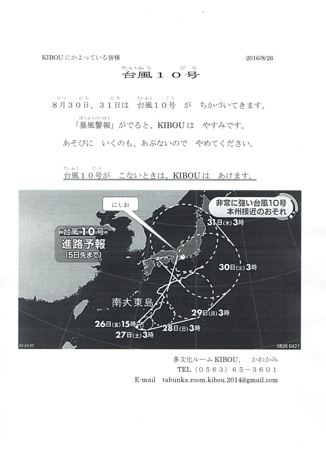 台風(たいふう)のときは、やすみです。 共有: X で共有 (新しいウィンドウで開きます) X Threads で共有 (新しいウィンドウで開きます) Threads Facebook で共有 (新しいウィンドウで開きます) Facebook WhatsApp で共有 (新しいウィンドウで開きます) WhatsApp 友達にメールでリンクを送信 (新しいウィンドウで開きます) メールアドレス 印刷 (新しいウィンドウで開きます) 印刷 いいね 読み込み中… 関連 2016年8月26日2020年5月1日 by 多文化ルームKIBOU Categories: お知らせTags: にほんご