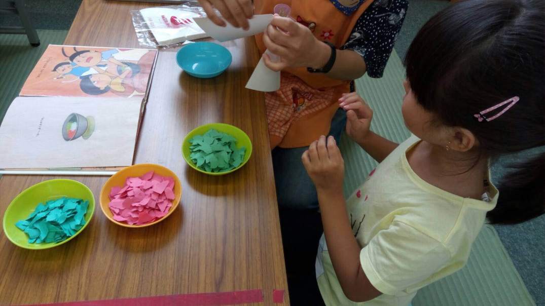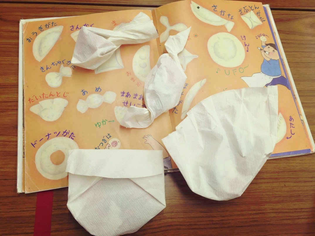 Após ler a histórinha, brincamos de fazer GYÔZA com papéis.