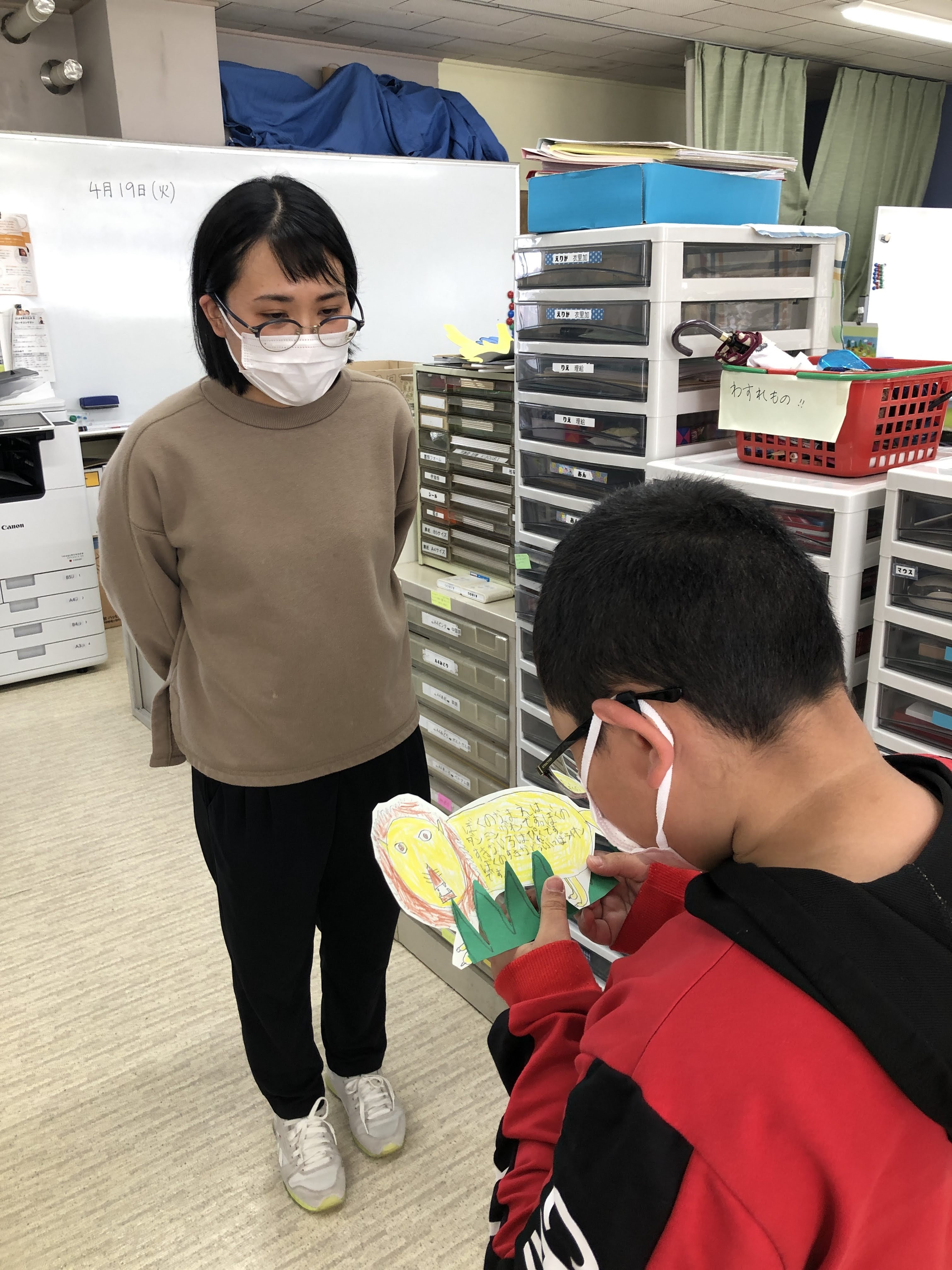 じこしょうかい カード しょうがくせいの みんなは、 じこしょうかい カードを つくっています。 さいしょは、ちいさくて ひかえめだったんだけど、 どんどん おおきく いろんな かたちの カードが ふえていっています! かべいっぱいに なると いいね! 共有: X で共有 (新しいウィンドウで開きます) X Threads で共有 (新しいウィンドウで開きます) Threads Facebook で共有 (新しいウィンドウで開きます) Facebook WhatsApp で共有 (新しいウィンドウで開きます) WhatsApp 友達にメールでリンクを送信 (新しいウィンドウで開きます) メールアドレス 印刷 (新しいウィンドウで開きます) 印刷 いいね 読み込み中… 関連 2022年4月24日 by 多文化ルームKIBOU Categories: 小中学生クラスTags: にほんご