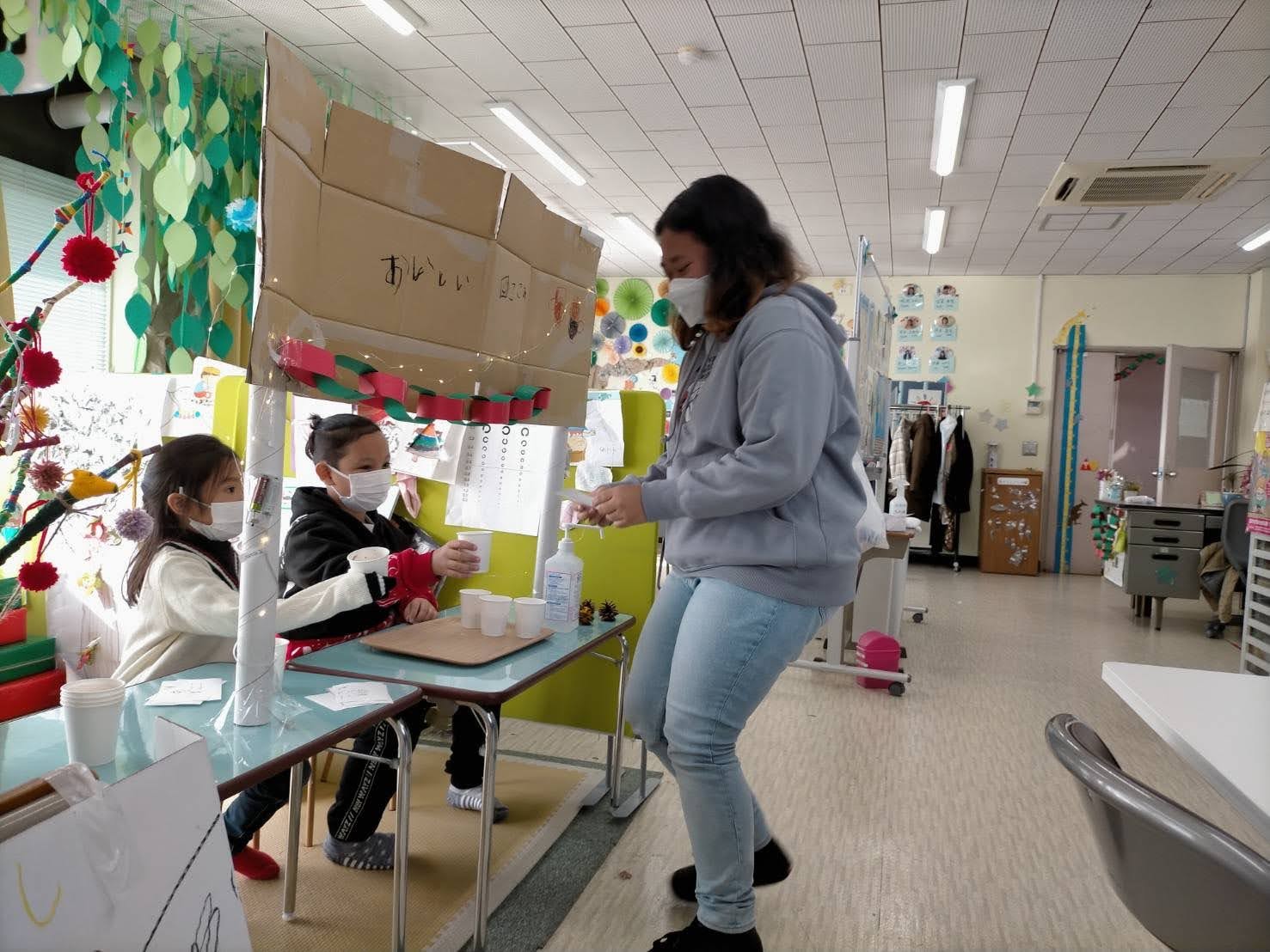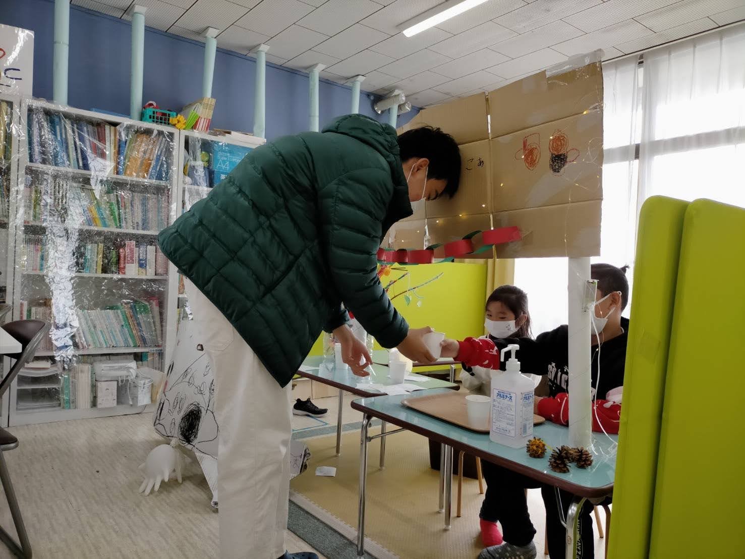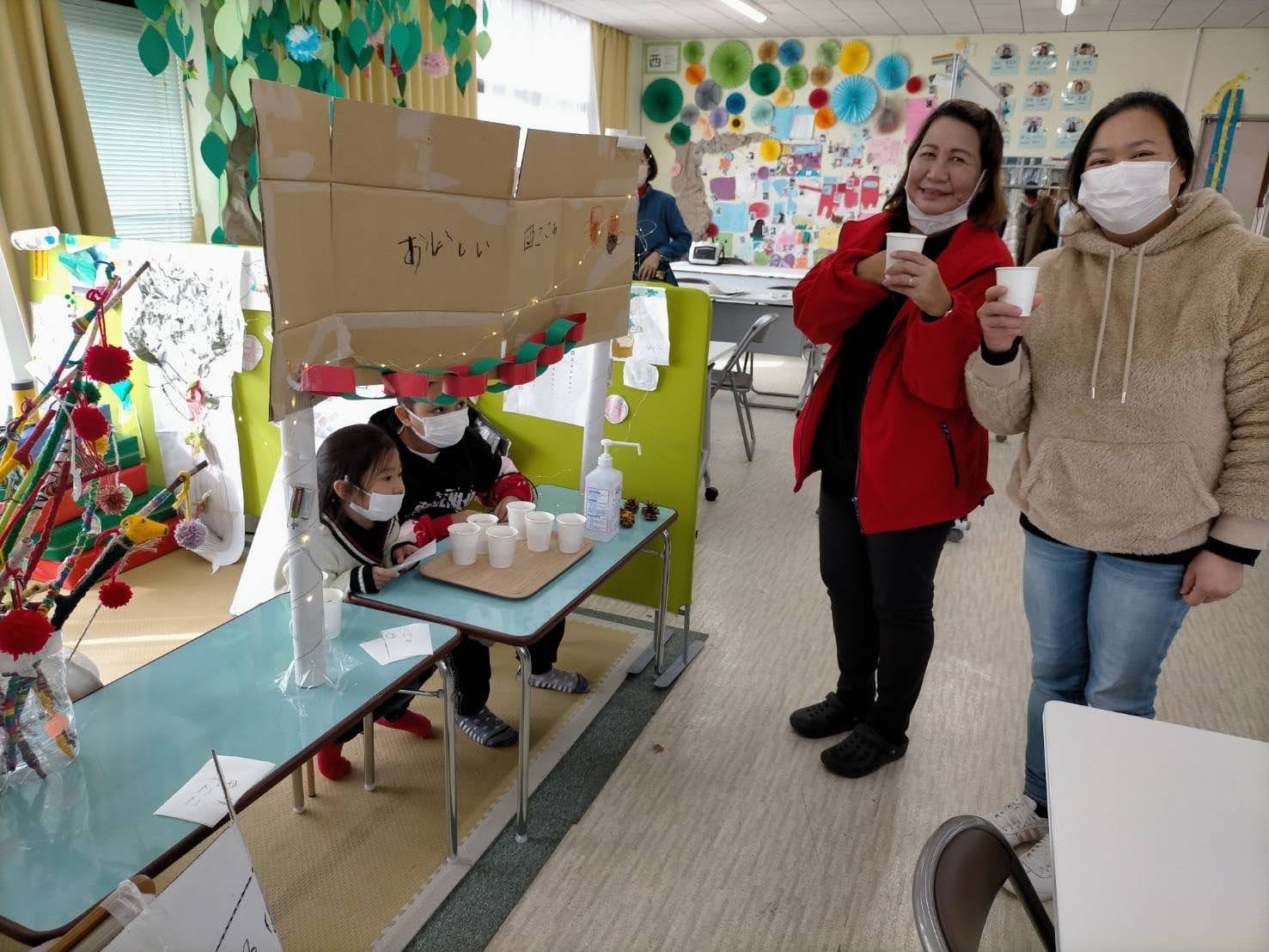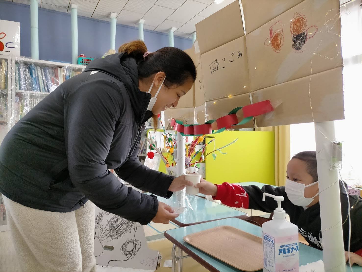 かねんれいクラスのおにいさん、おねえさん、おかあさんたちに「FREE DRINK」チケットをわたして