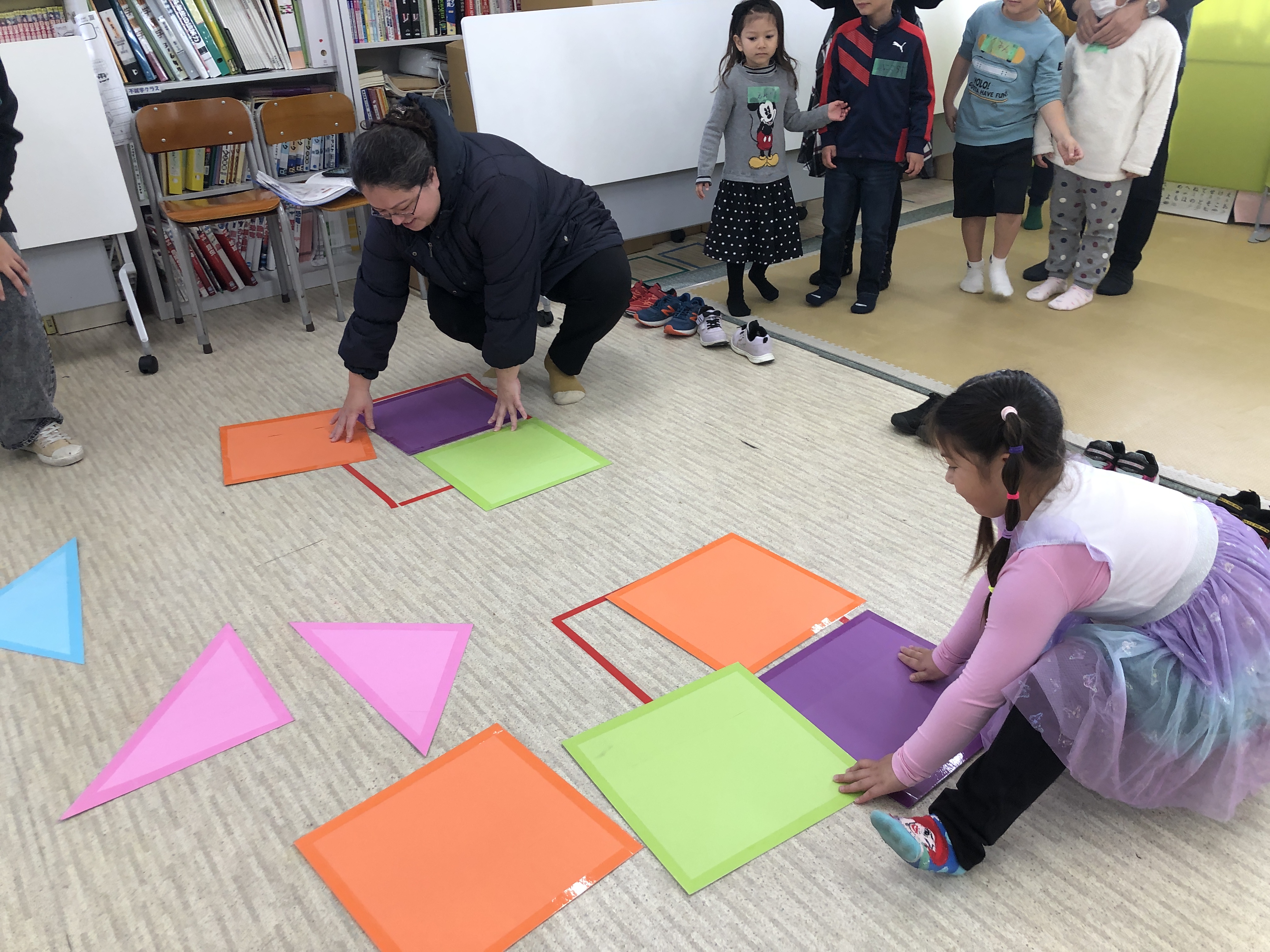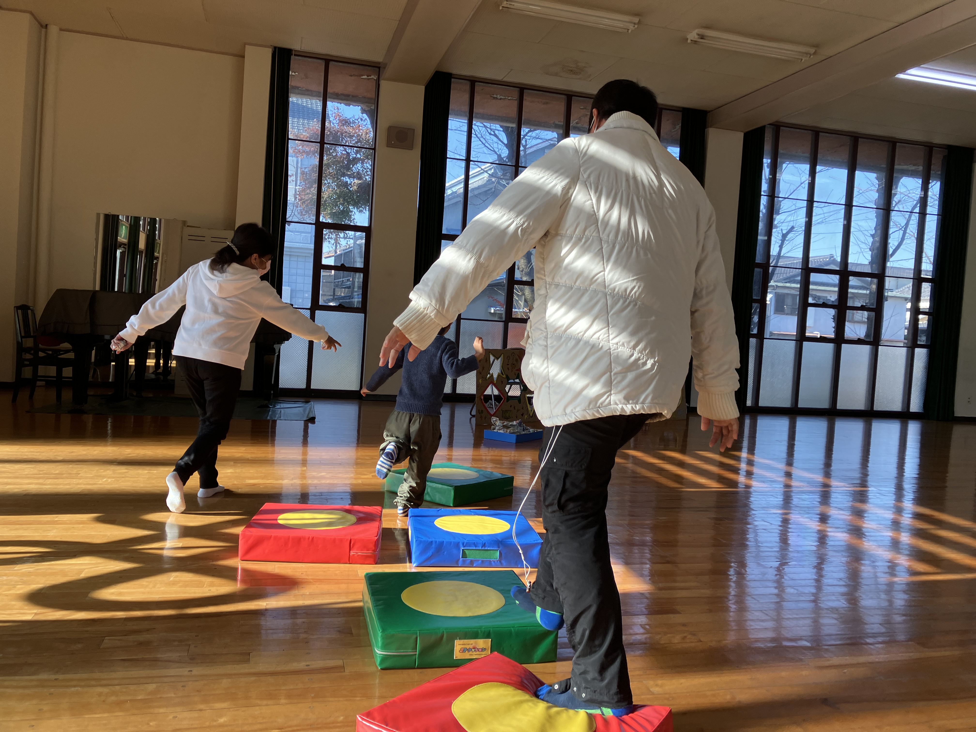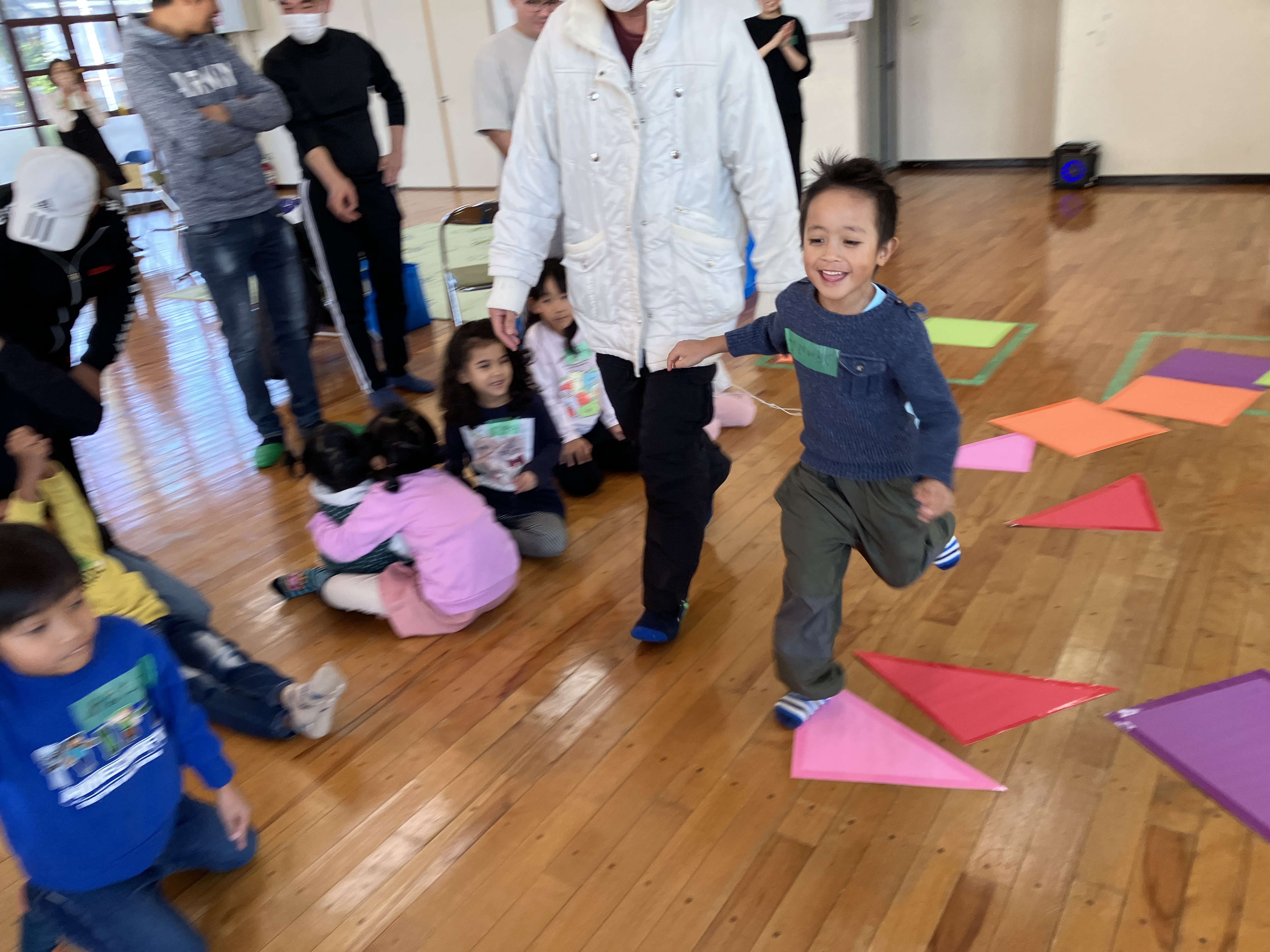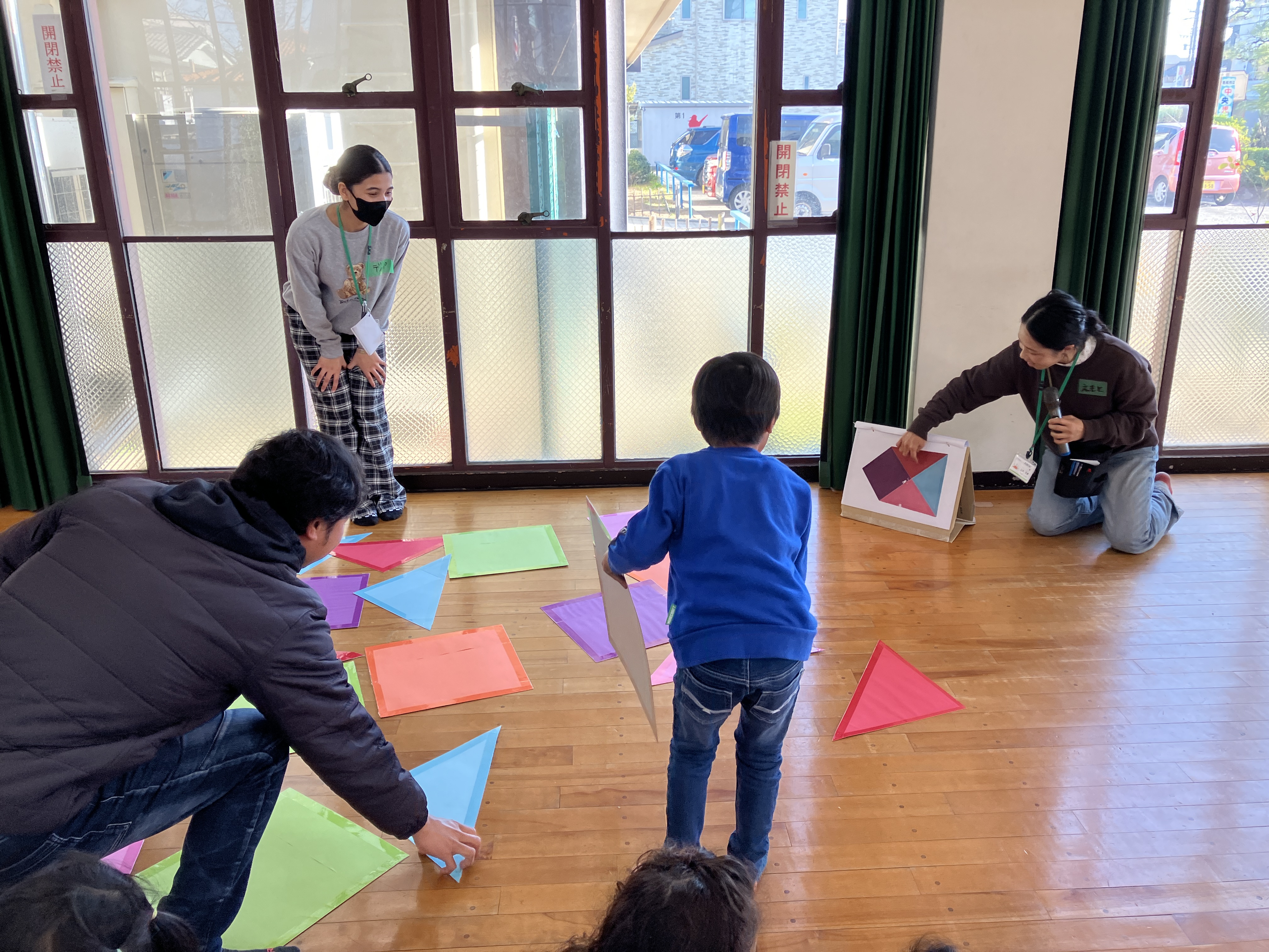 おとうさんも、おかあさんも いっしょに、かたちを つかった レクリエーションを しました。