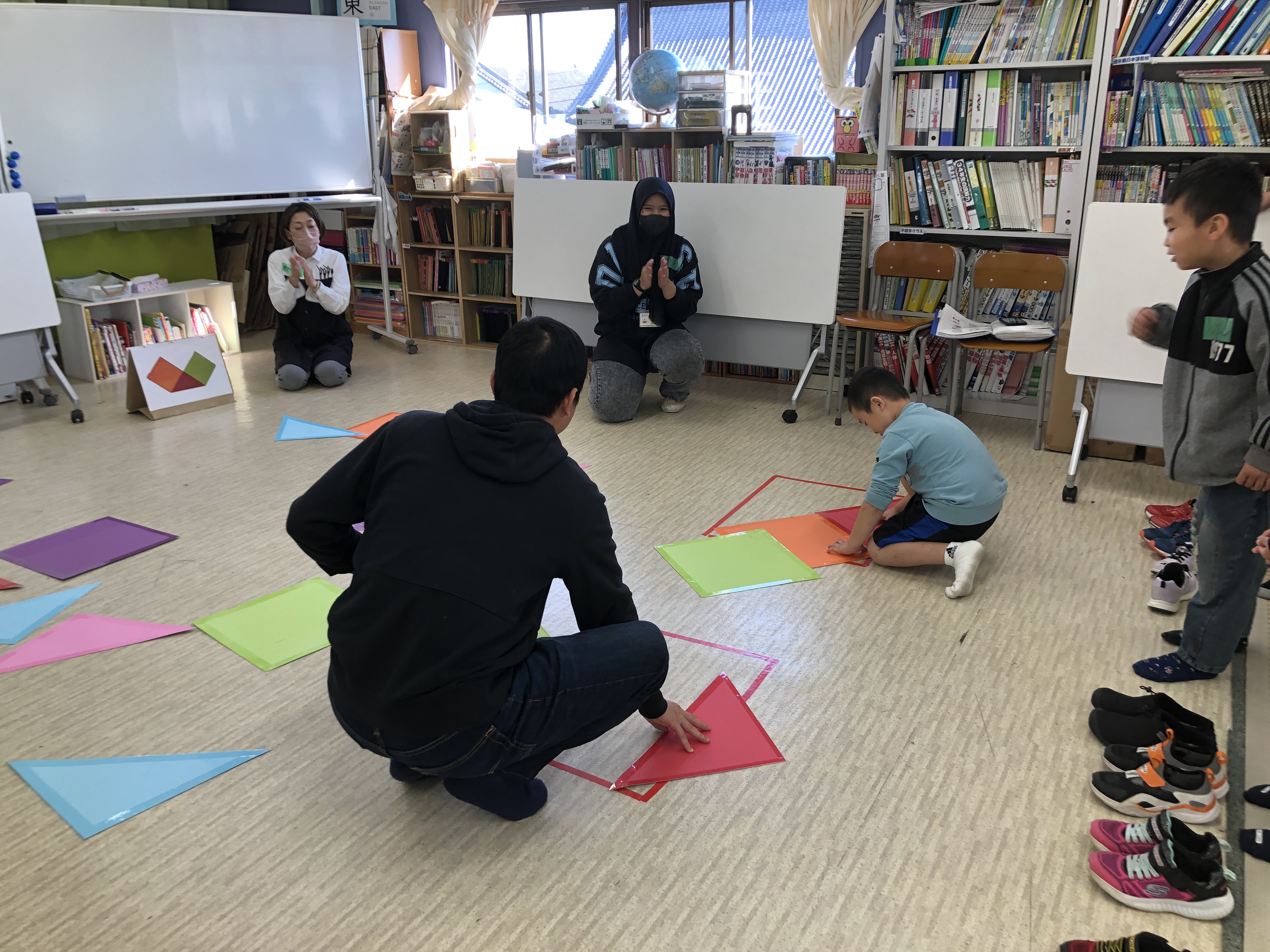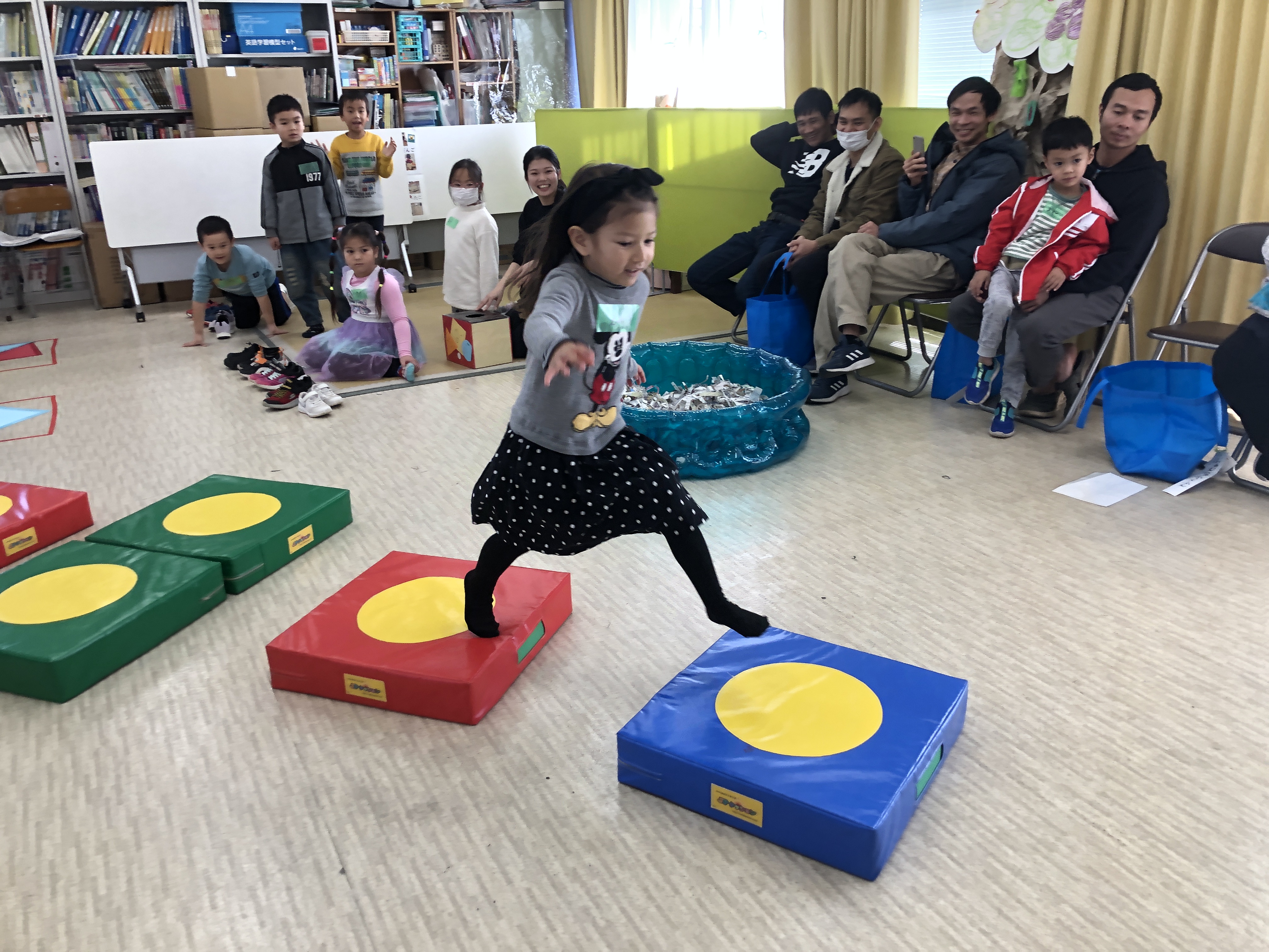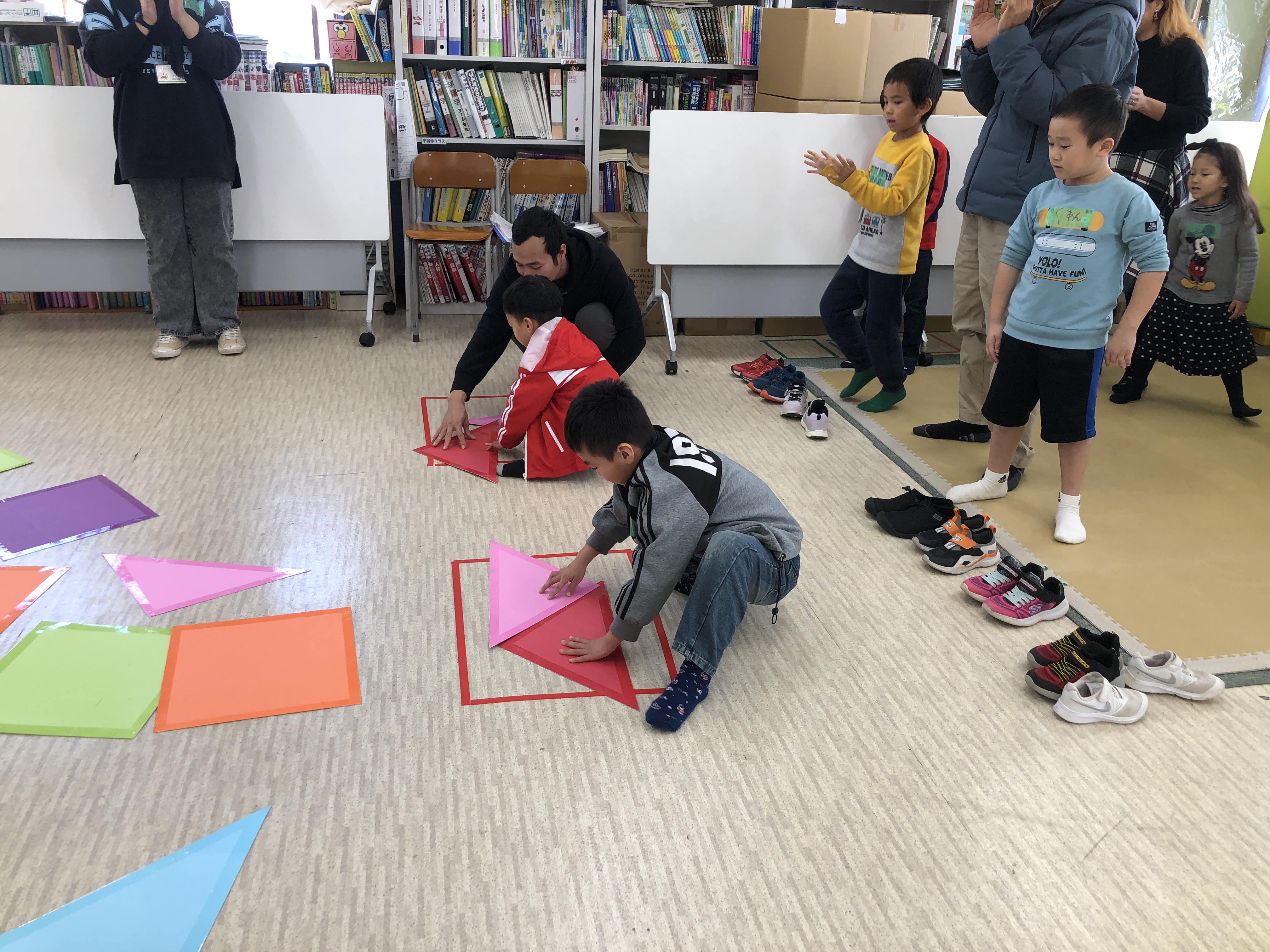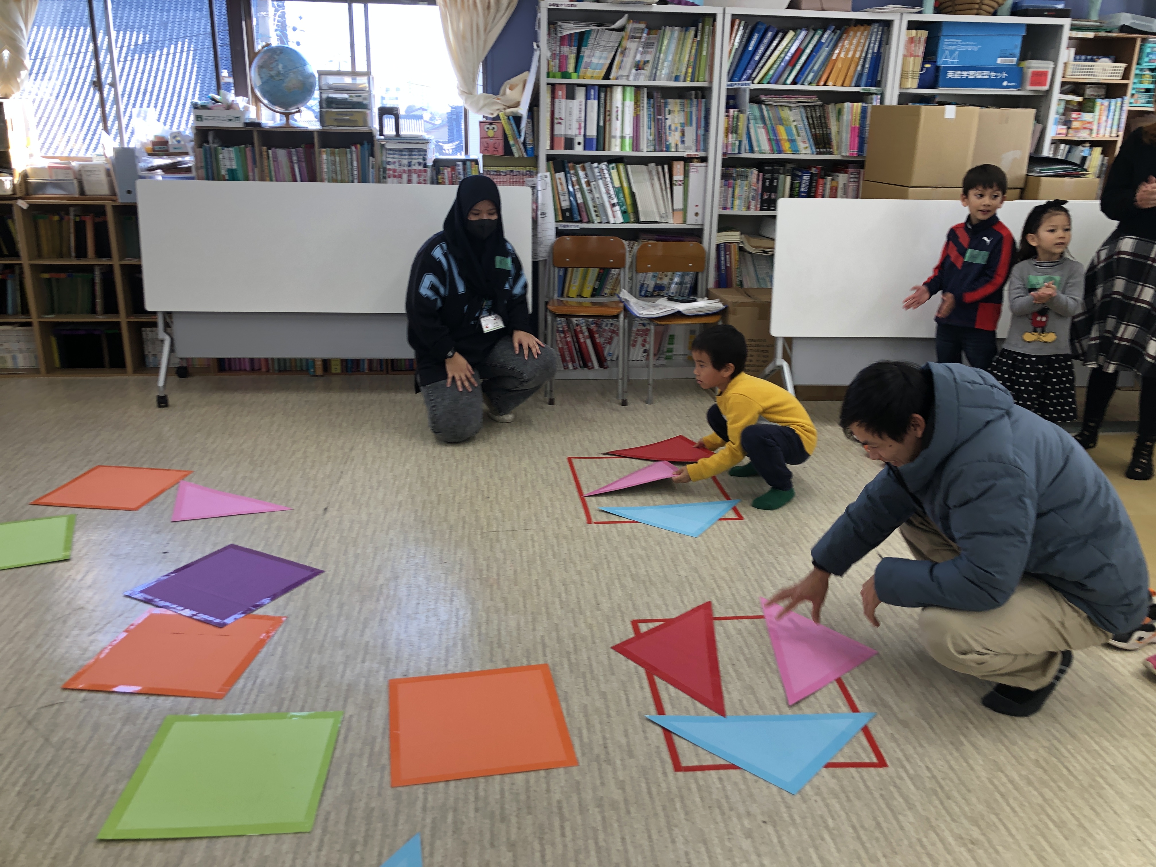 おとうさんも、おかあさんも いっしょに、かたちを つかった レクリエーションを しました。