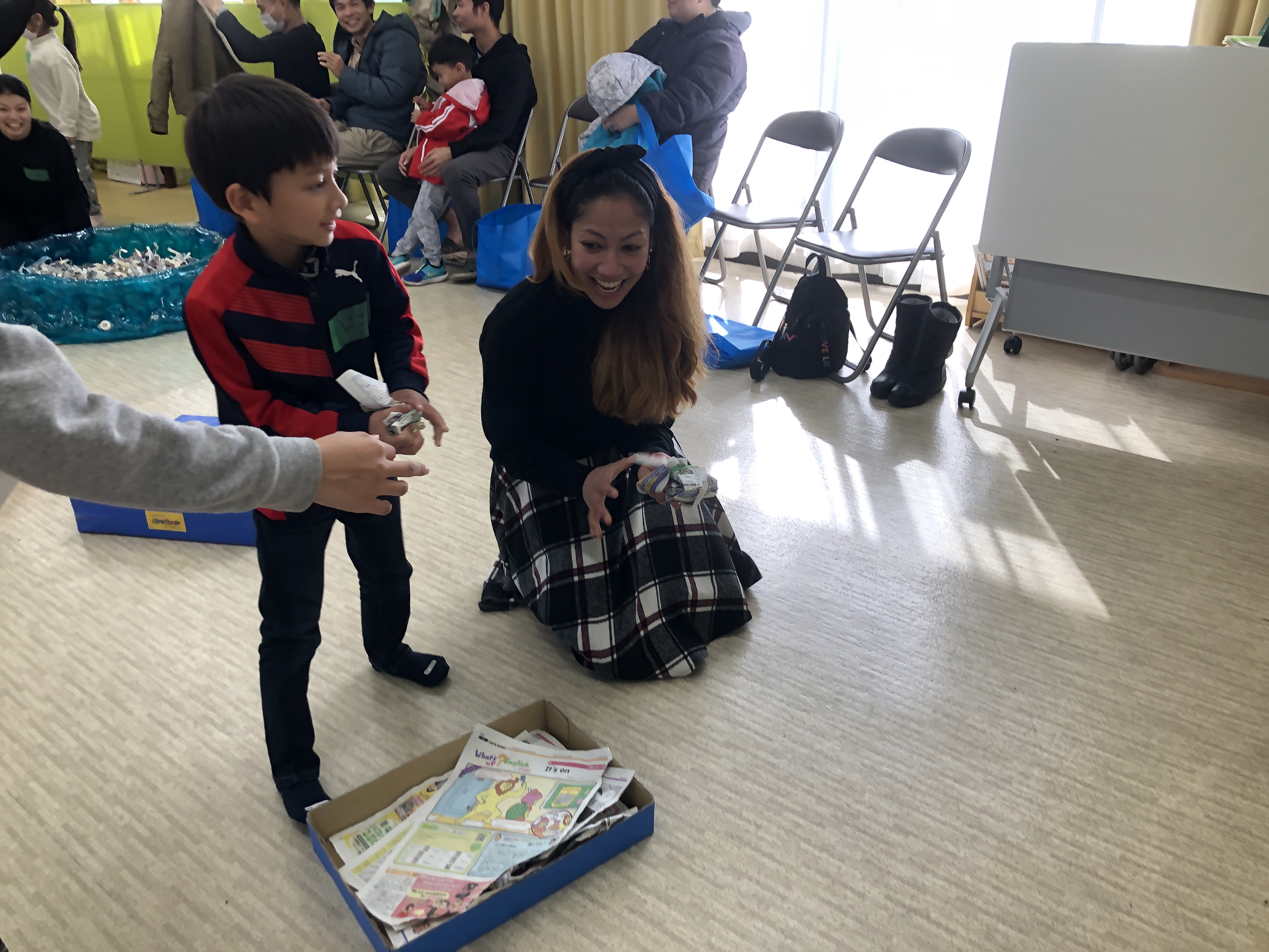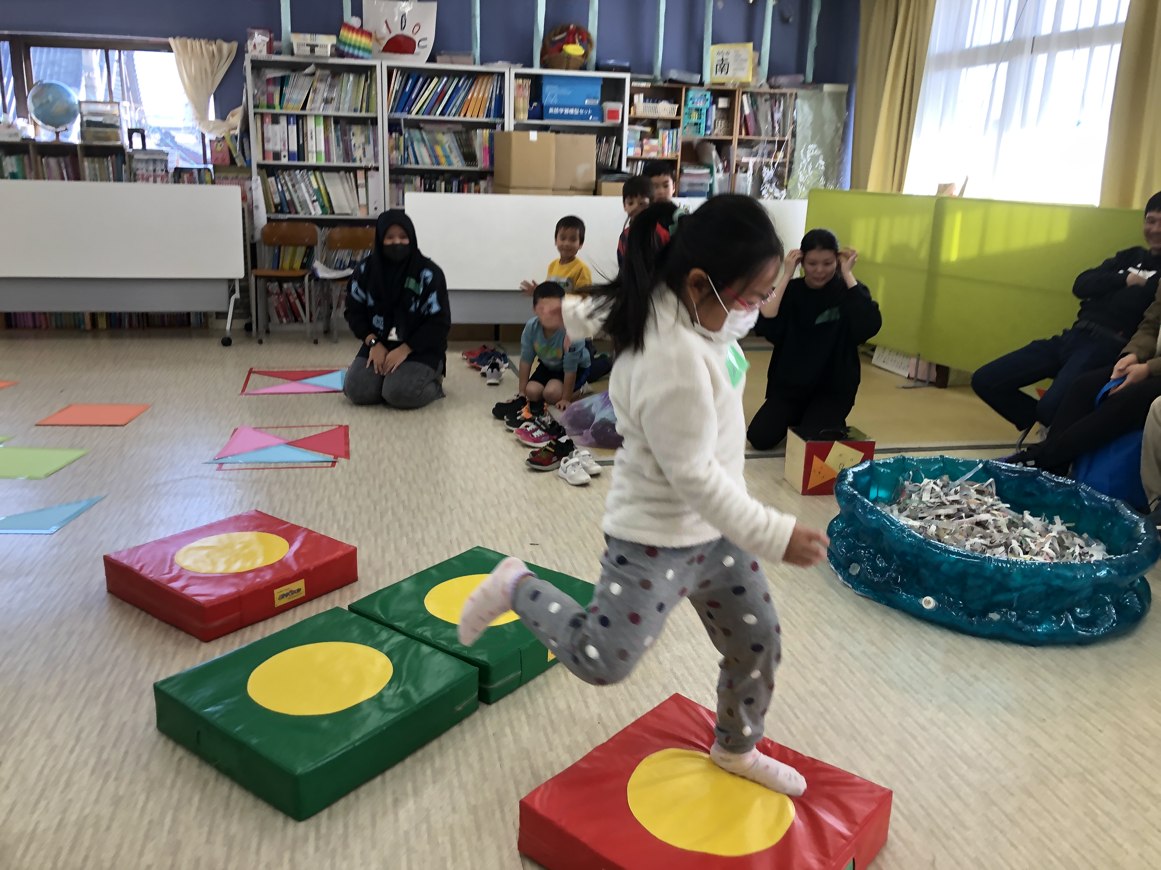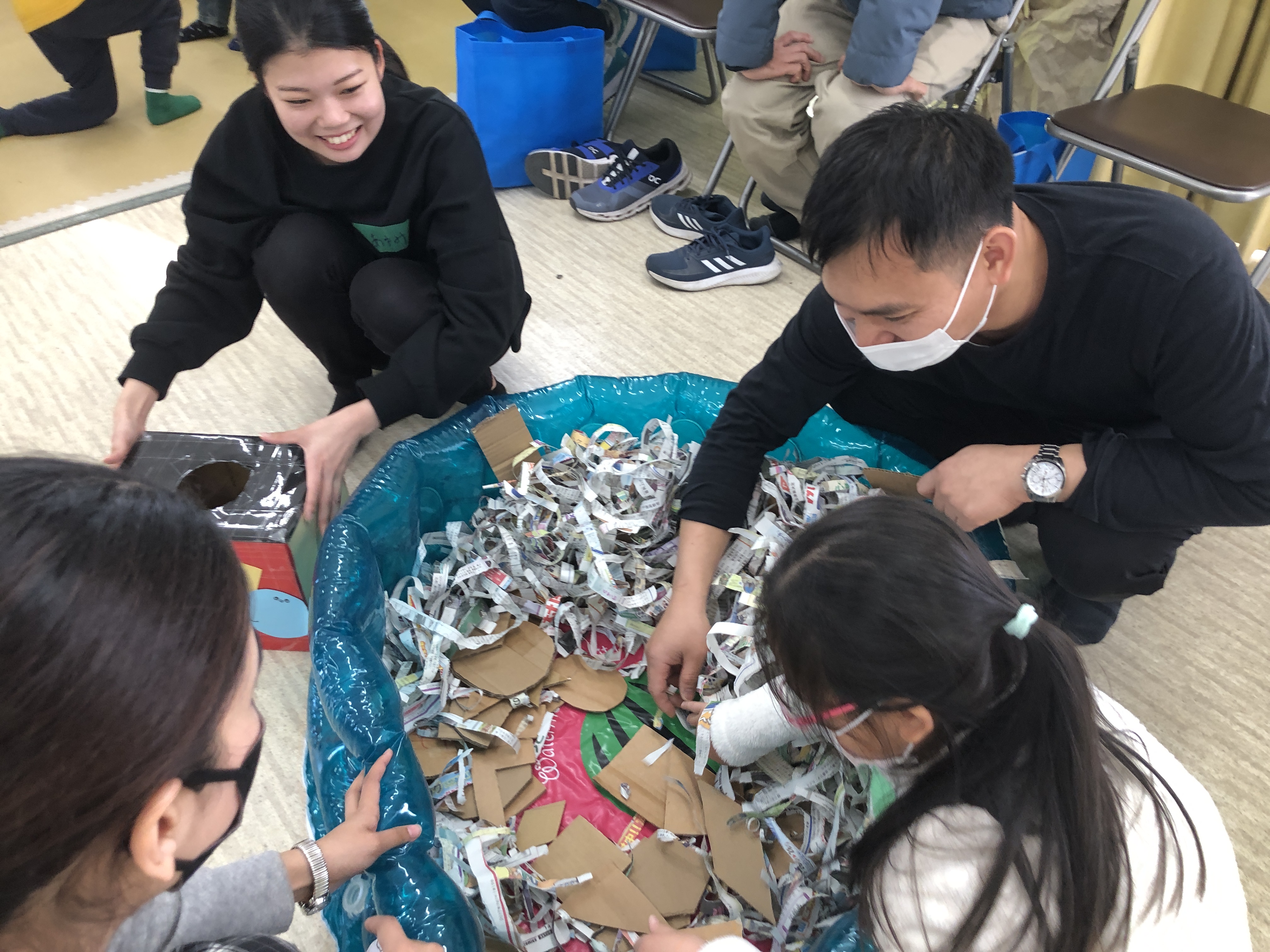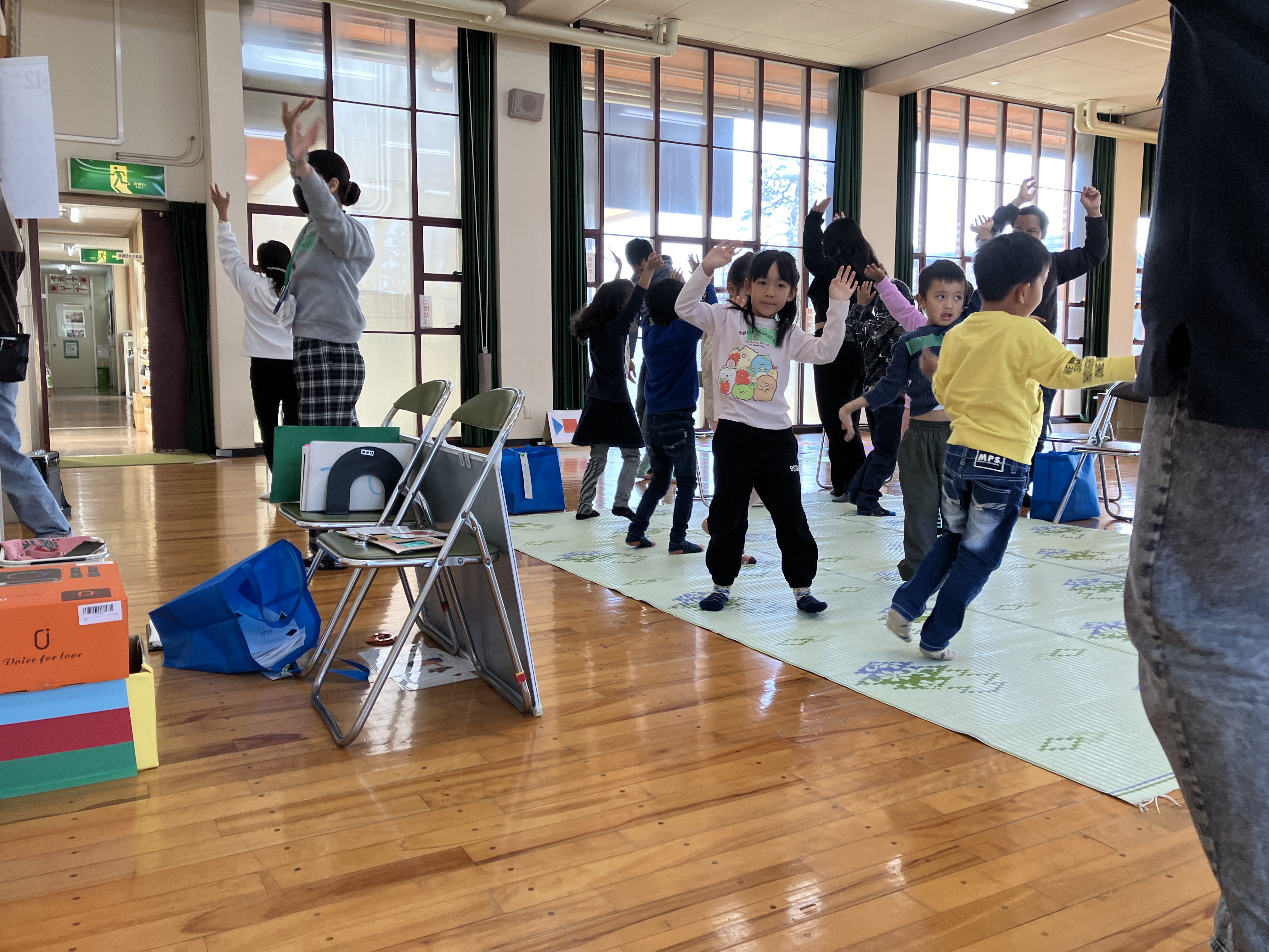 おとうさんも、おかあさんも いっしょに、かたちを つかった レクリエーションを しました。