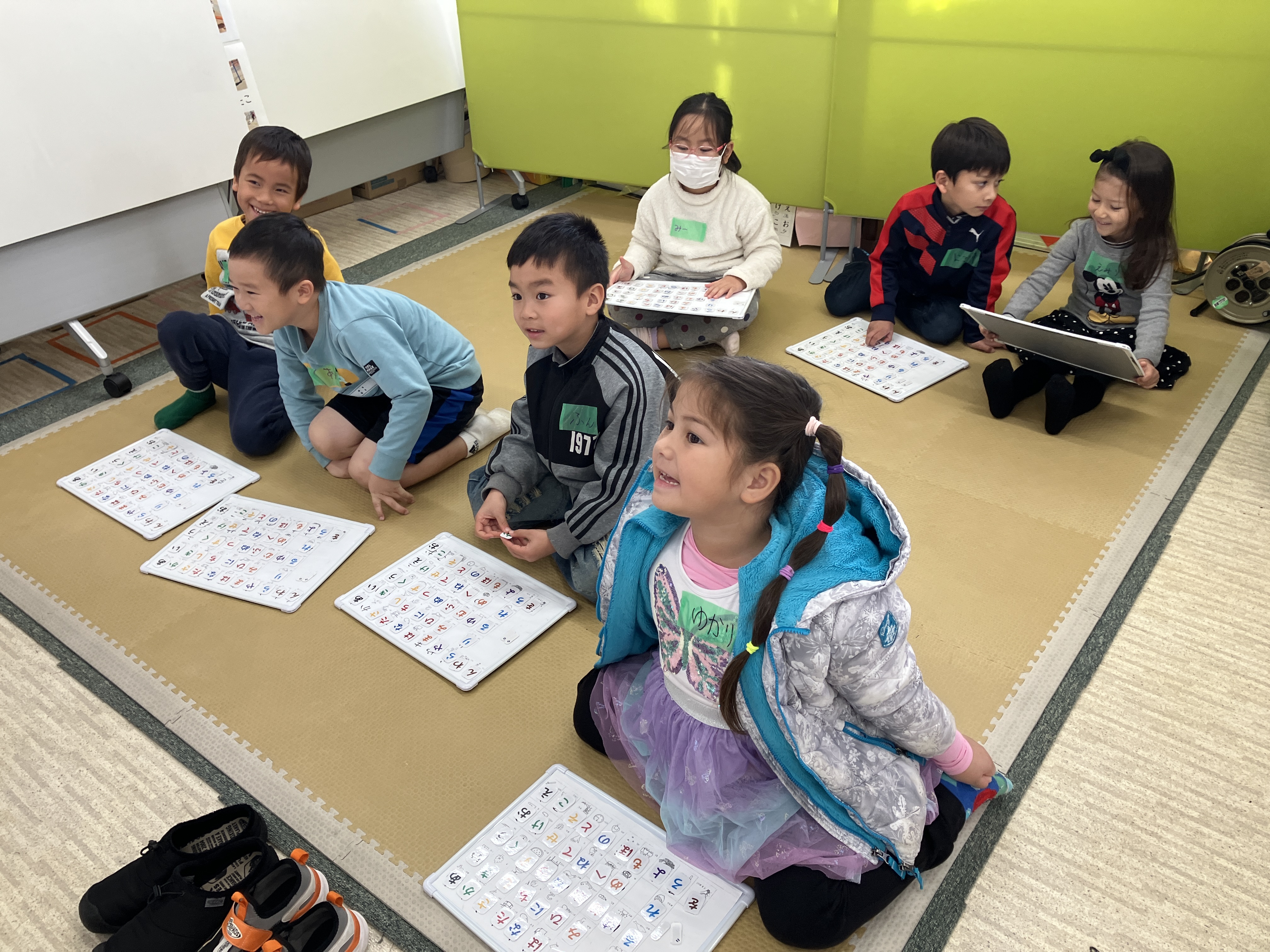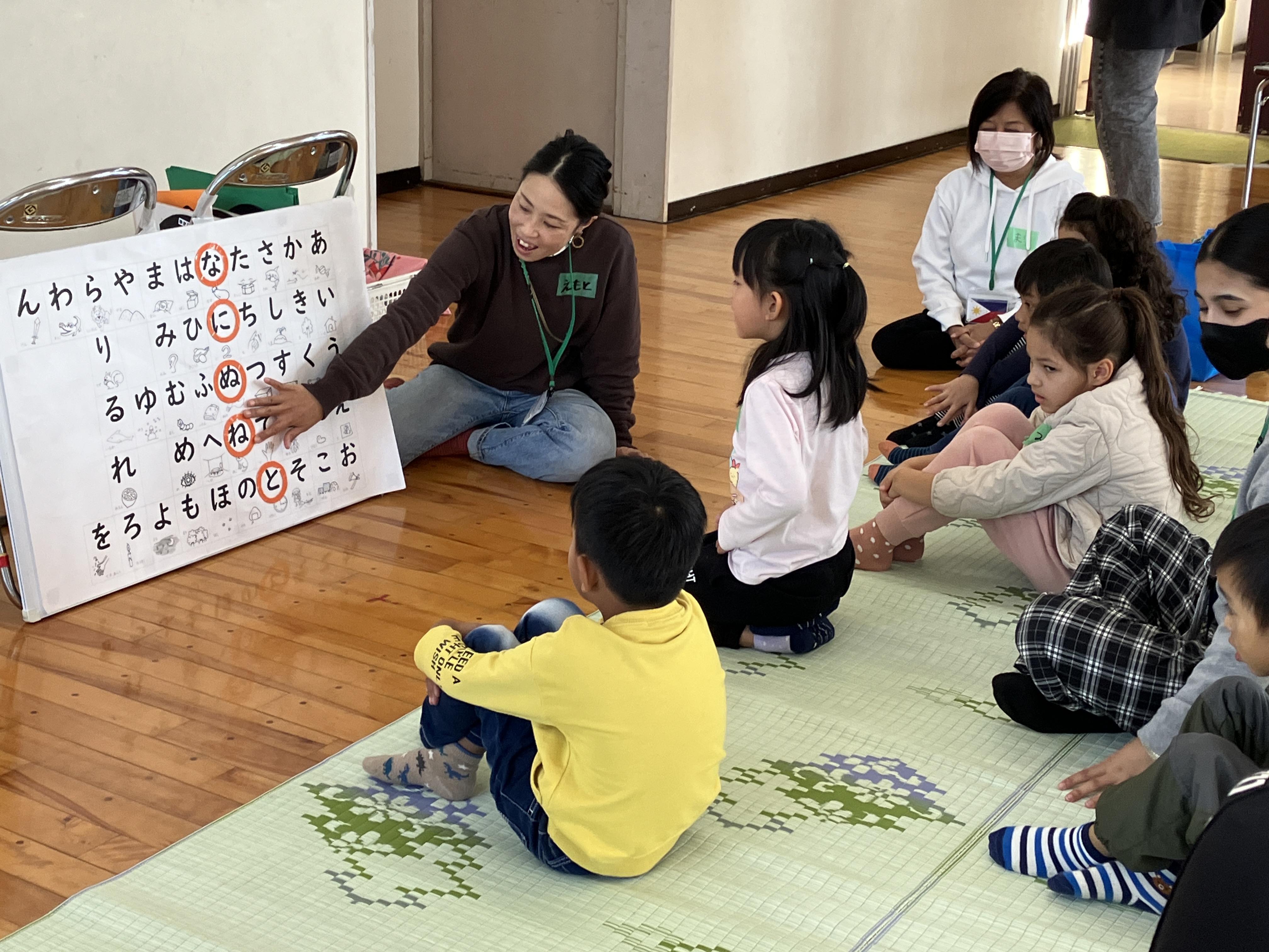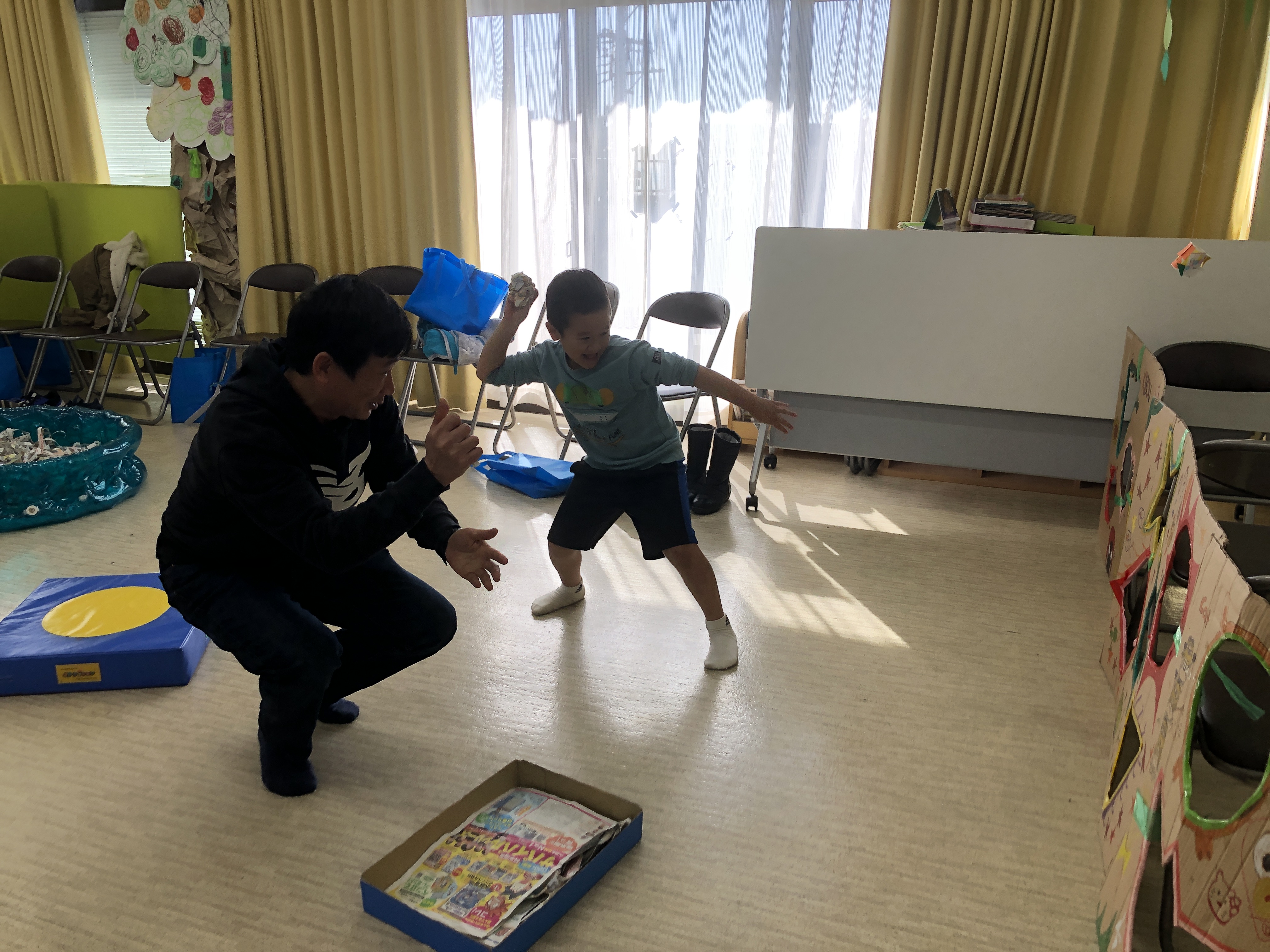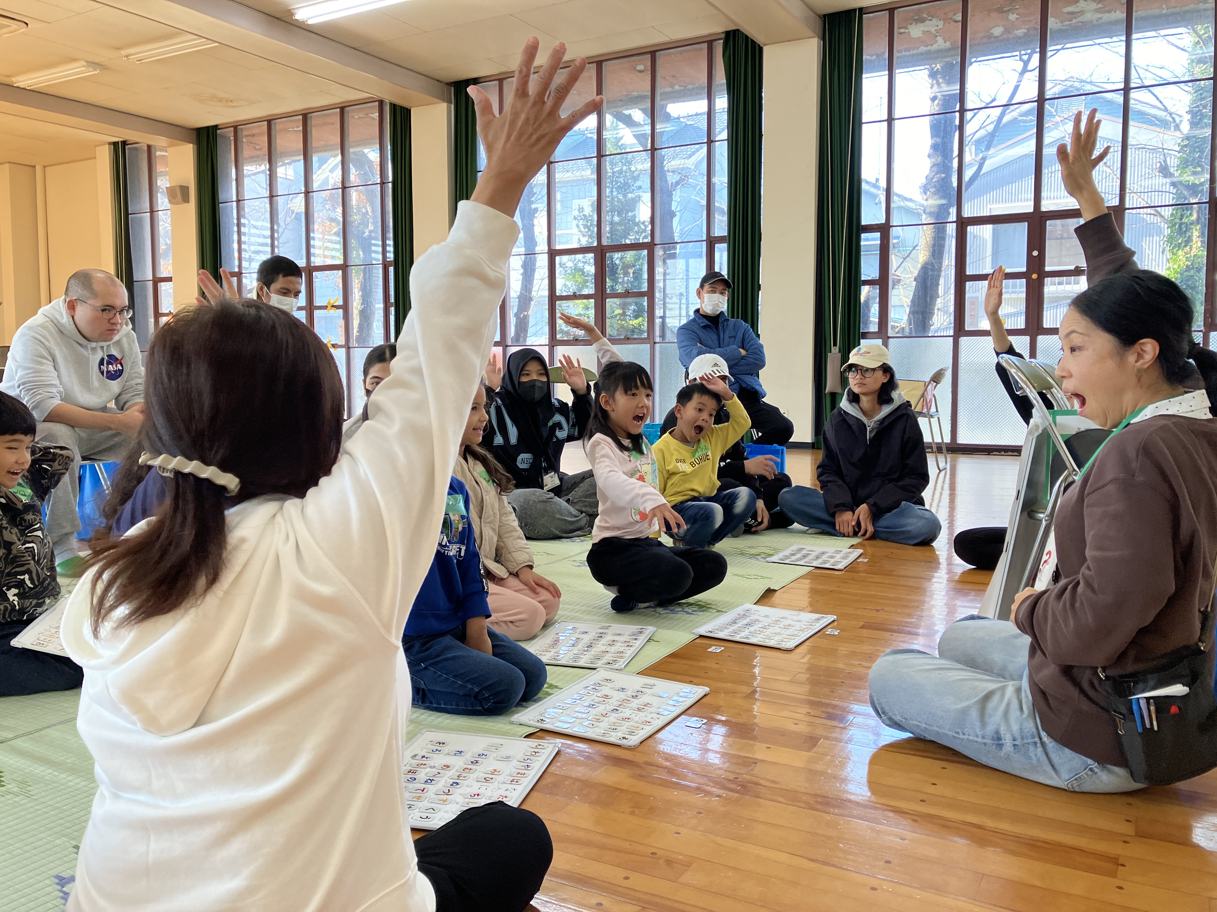 おとうさんも、おかあさんも いっしょに、かたちを つかった レクリエーションを しました。