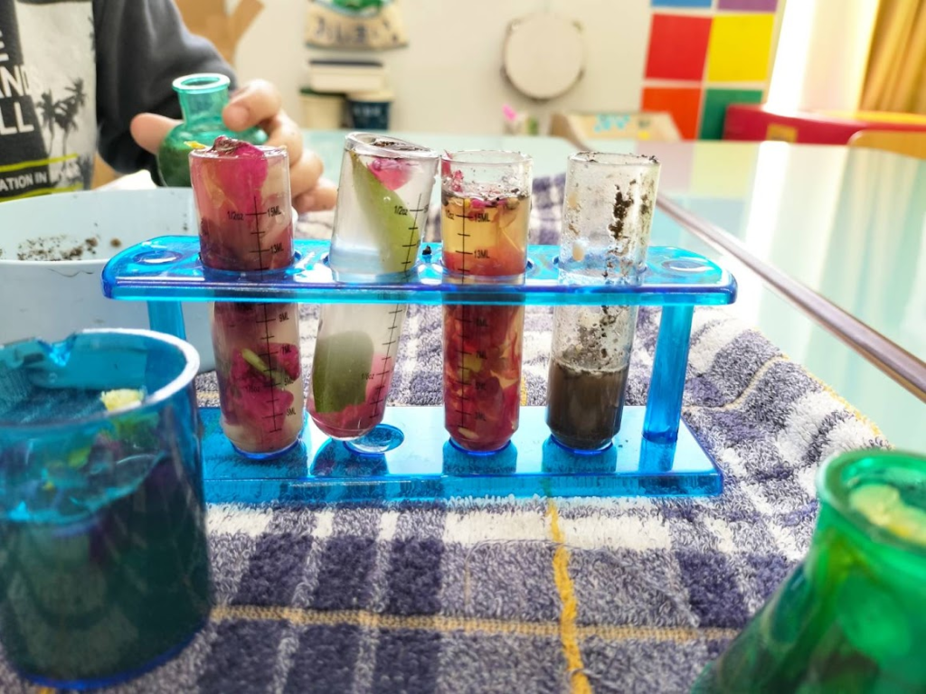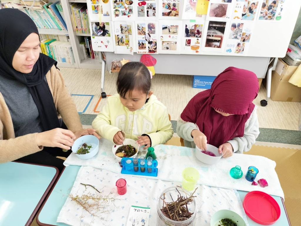 Mag ipon ng damo,bulaklak,lupa at mga sanga ng kahoy…….、