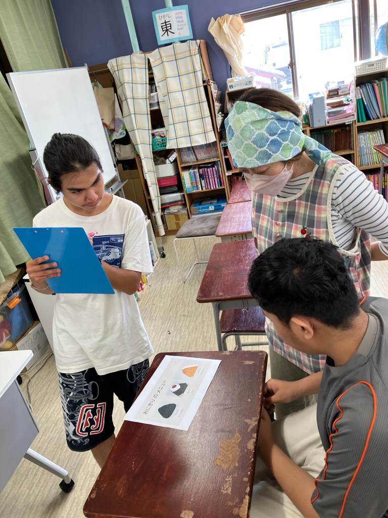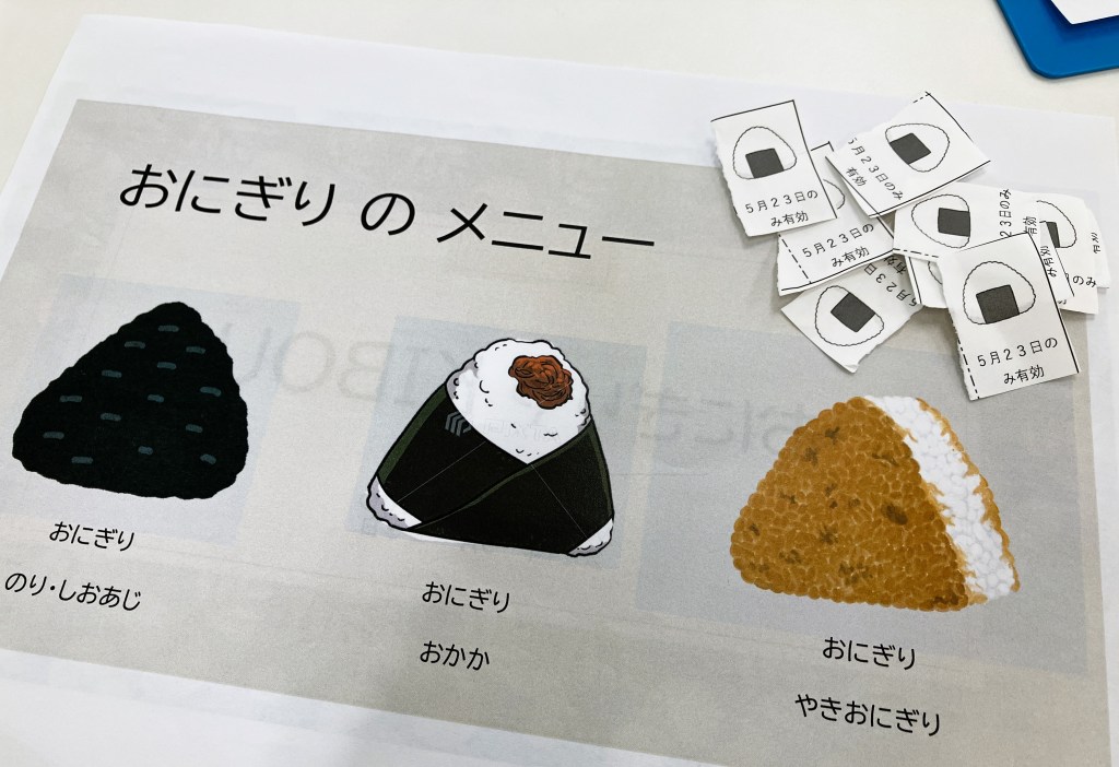 水曜日には、おにぎりの具の買い出しに行って、みんなに「おにぎり ひきかえ券」をくばりました。