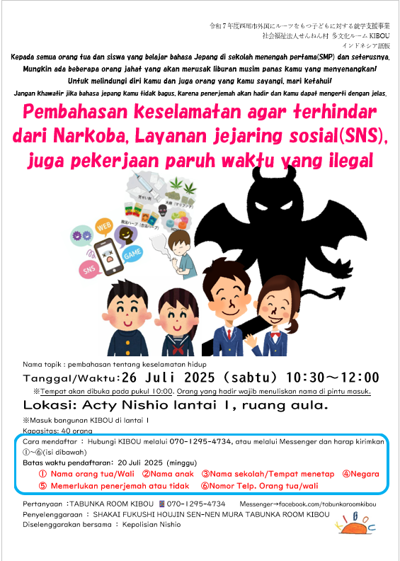 Pembahasan tentang keselamatan ini akan dijelaskan dalam bahasa Jepang yang mudah dipahami dan juga terdapat juru berbagai bahasa untuk berbicara dengan tema “cara menghindari keterlibatan dalam kejahatan seperti narkoba/YAKUBUTSU , media sosial/SNS, dan pekerjaan paruh waktu ilegal/YAMIBAITO”.