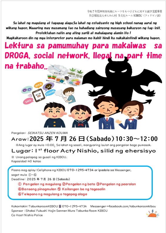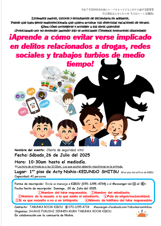 El tema de esta conferencia es sobre: “¡Aprender a cómo evitar verse implicado en delitos relacionados a drogas, redes sociales y trabajos turbios de medio tiempo! Esta conferencia se dará con explicaciones fáciles de entender, en Japonés simple y otros idiomas más.