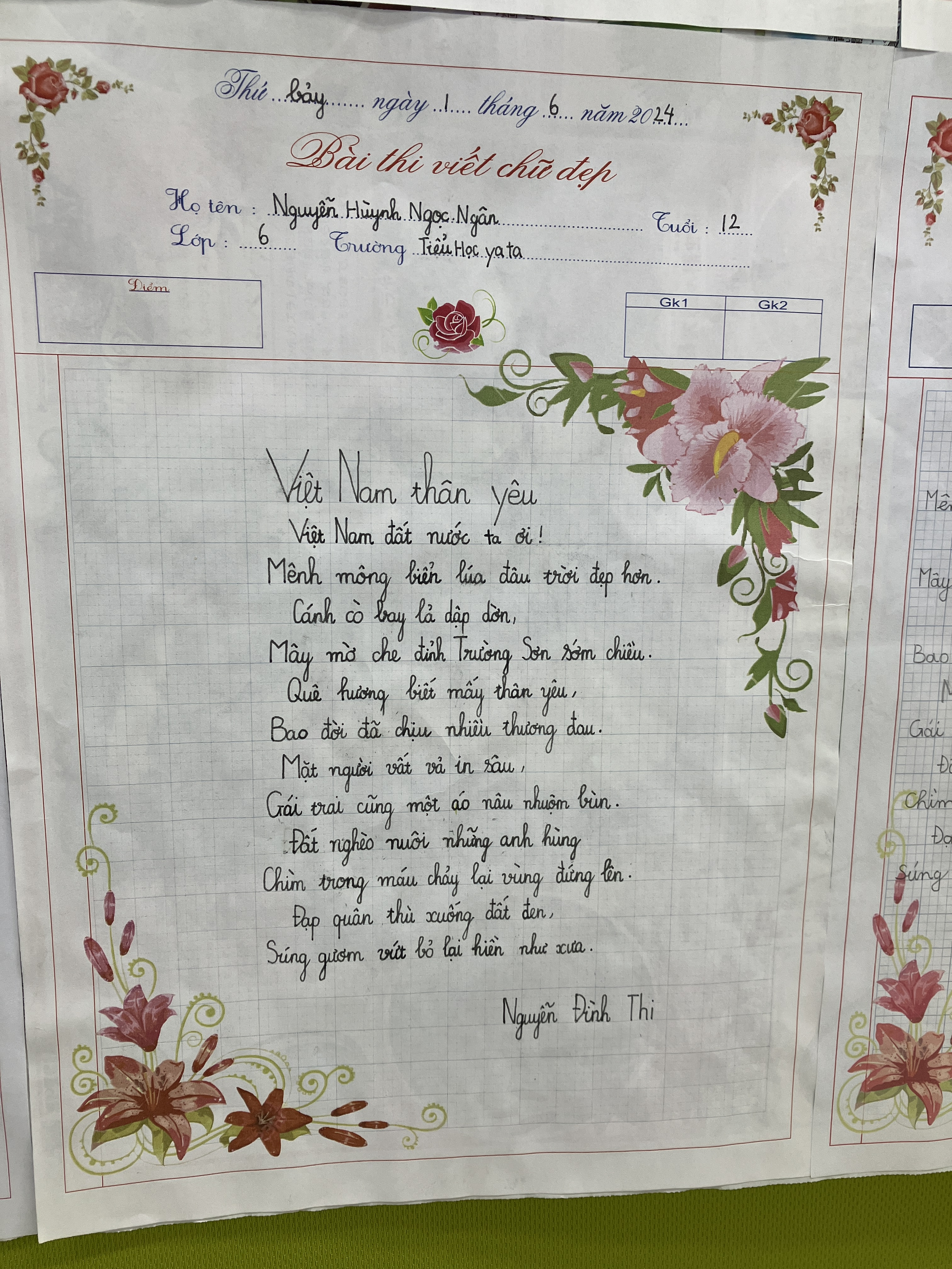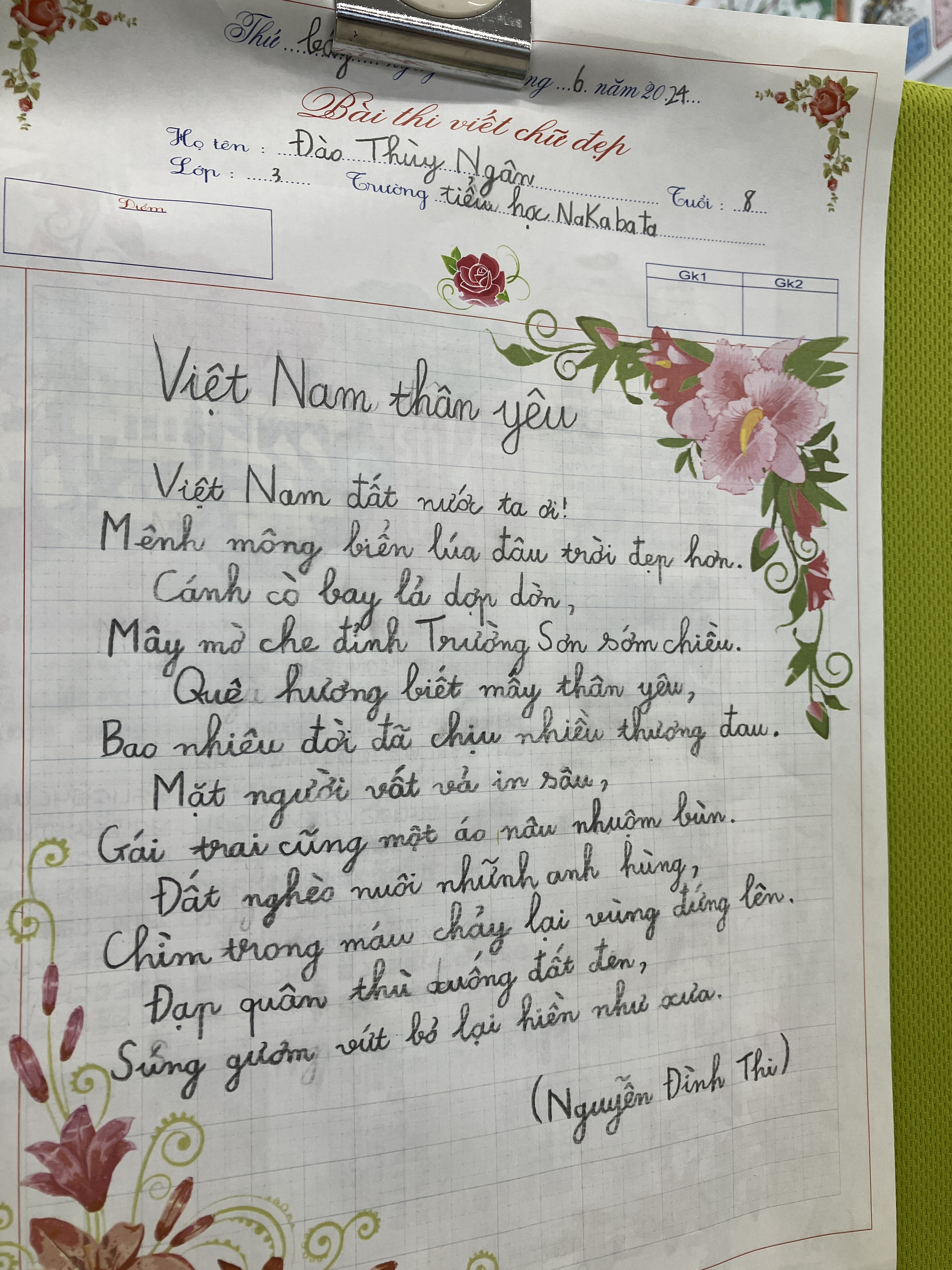 Bố: Hòa bình có màu đỏ, đất nước ta phải đánh đổi bằng bao hi sinh để có ngày hôm nay của con, hòa bình cũng có màu xanh, màu của Hi vọng, mong đất nước ta mãi hòa bình như thế này, mong rằng khắp nơi trên Trái Đất này, không nơi nào còn chiến tranh nữa.