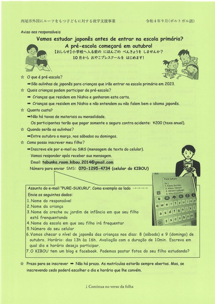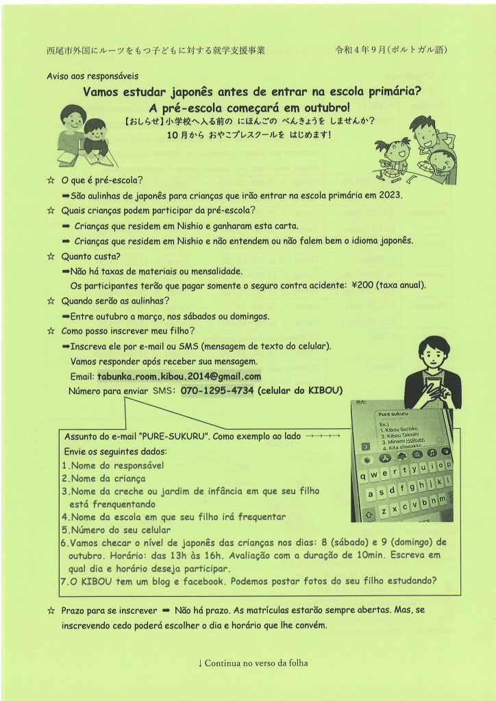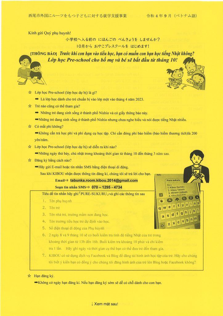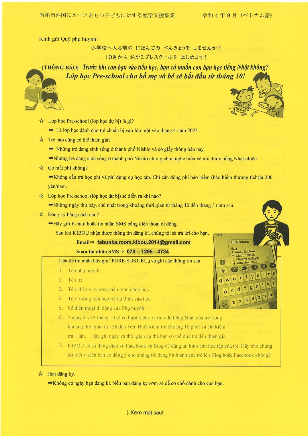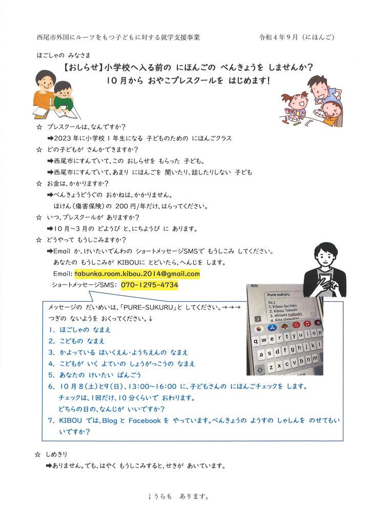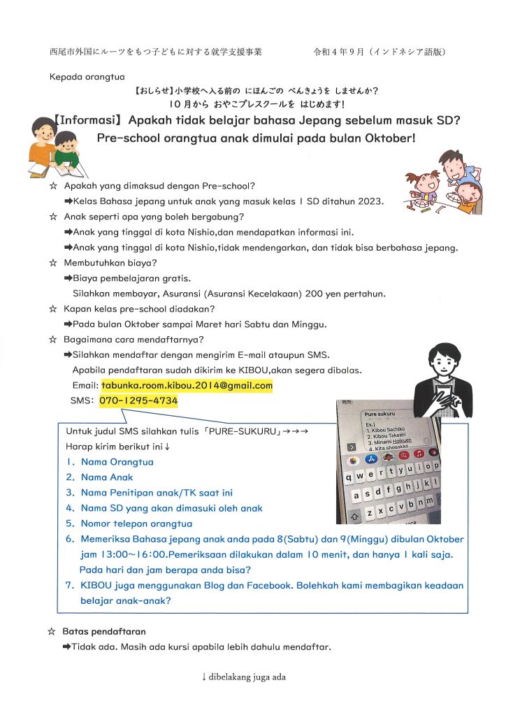 Pendaftaran:di messenger KIBOU atau、SMS di nomor 070-1295-4734.