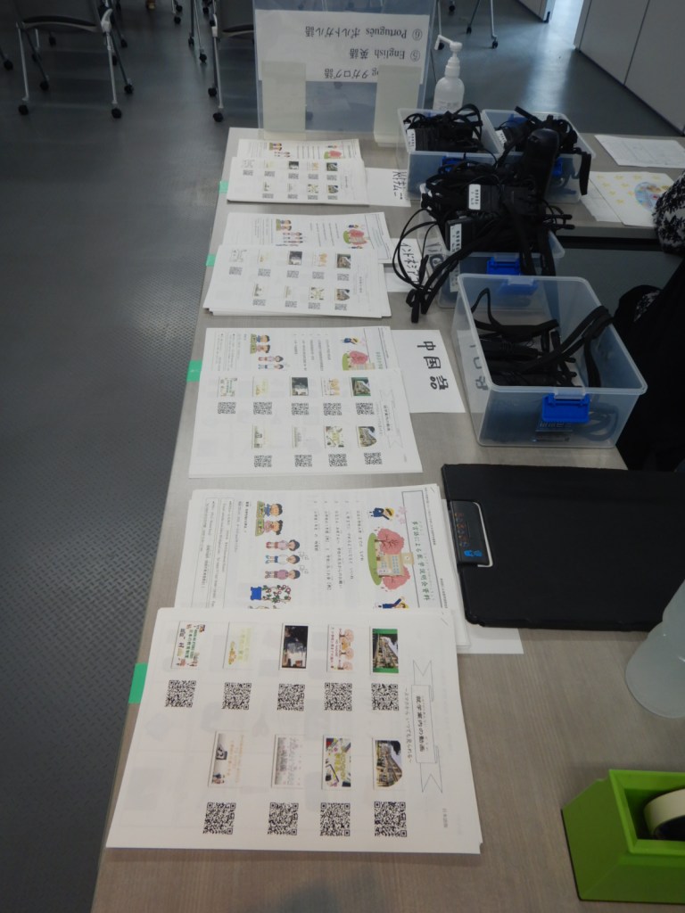 为了预防新冠感染、我们还向市教委借来了收听器为家长们进行了多语言同步翻译。