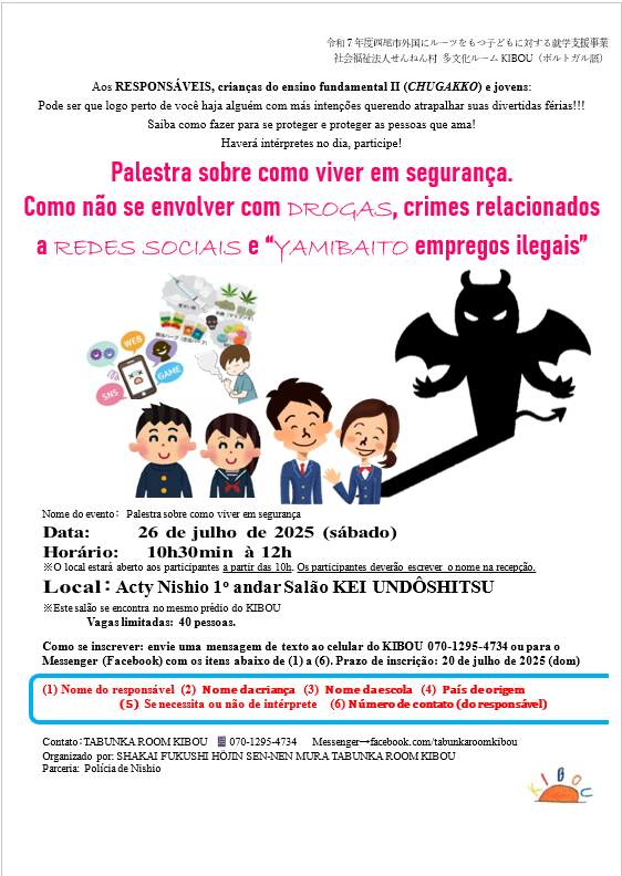 〈Como se inscrever〉Envie os seguintes dados para o celular do KIBOU: 070-1295-4734